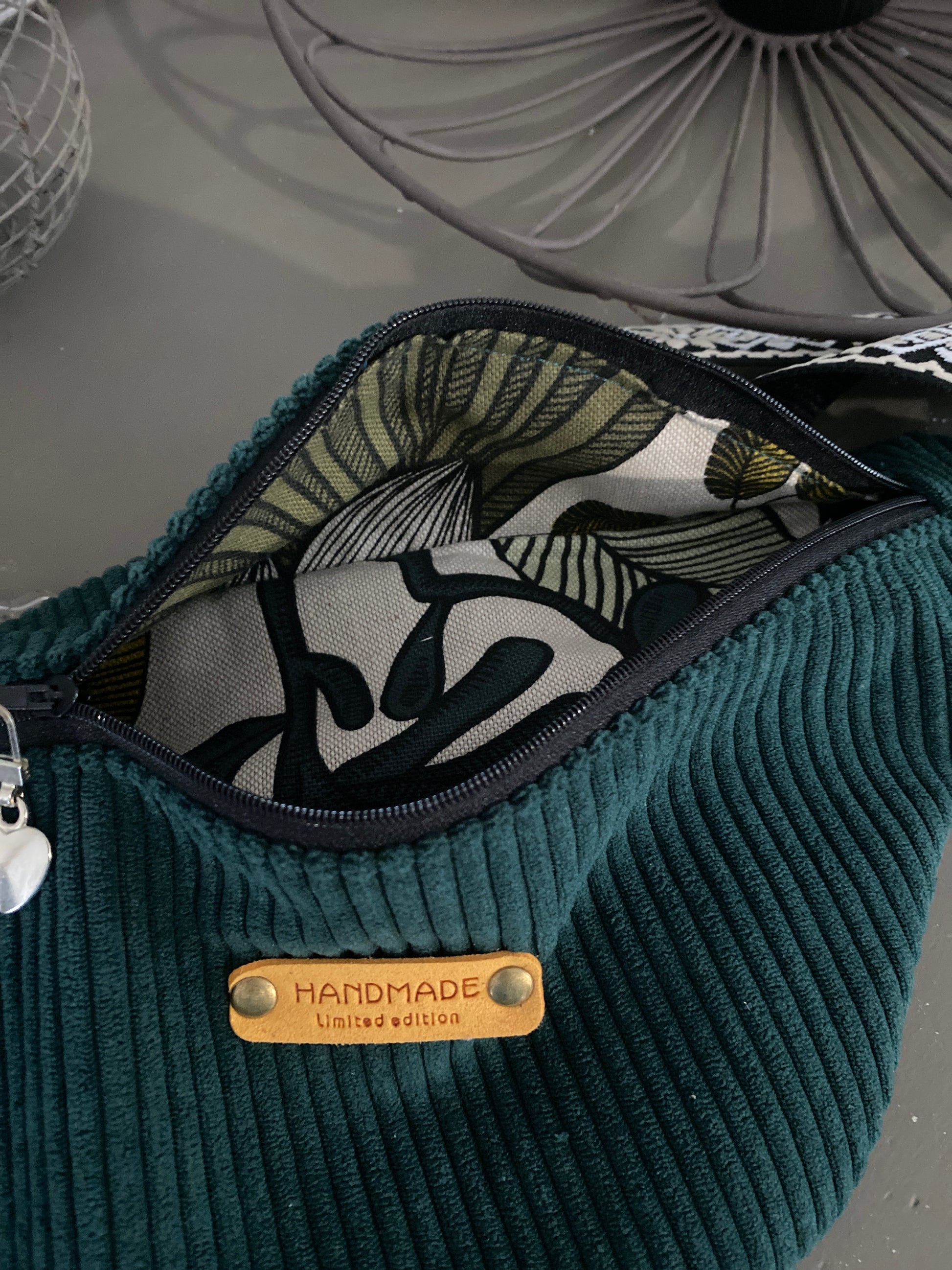 En velours qualité siège couleur vert sapin , elle est entièrement doublée coton , imprimé 🍃 feuilles