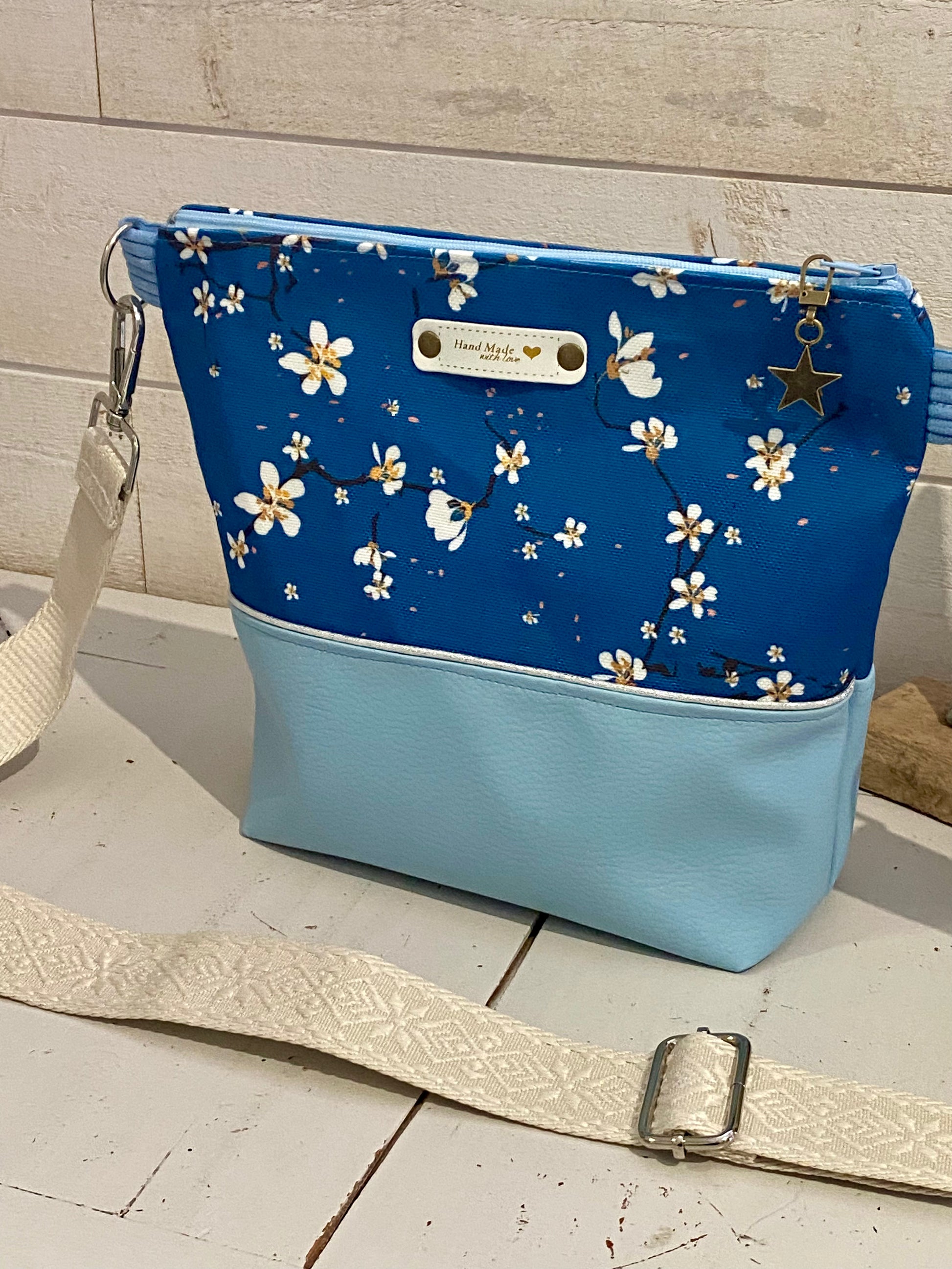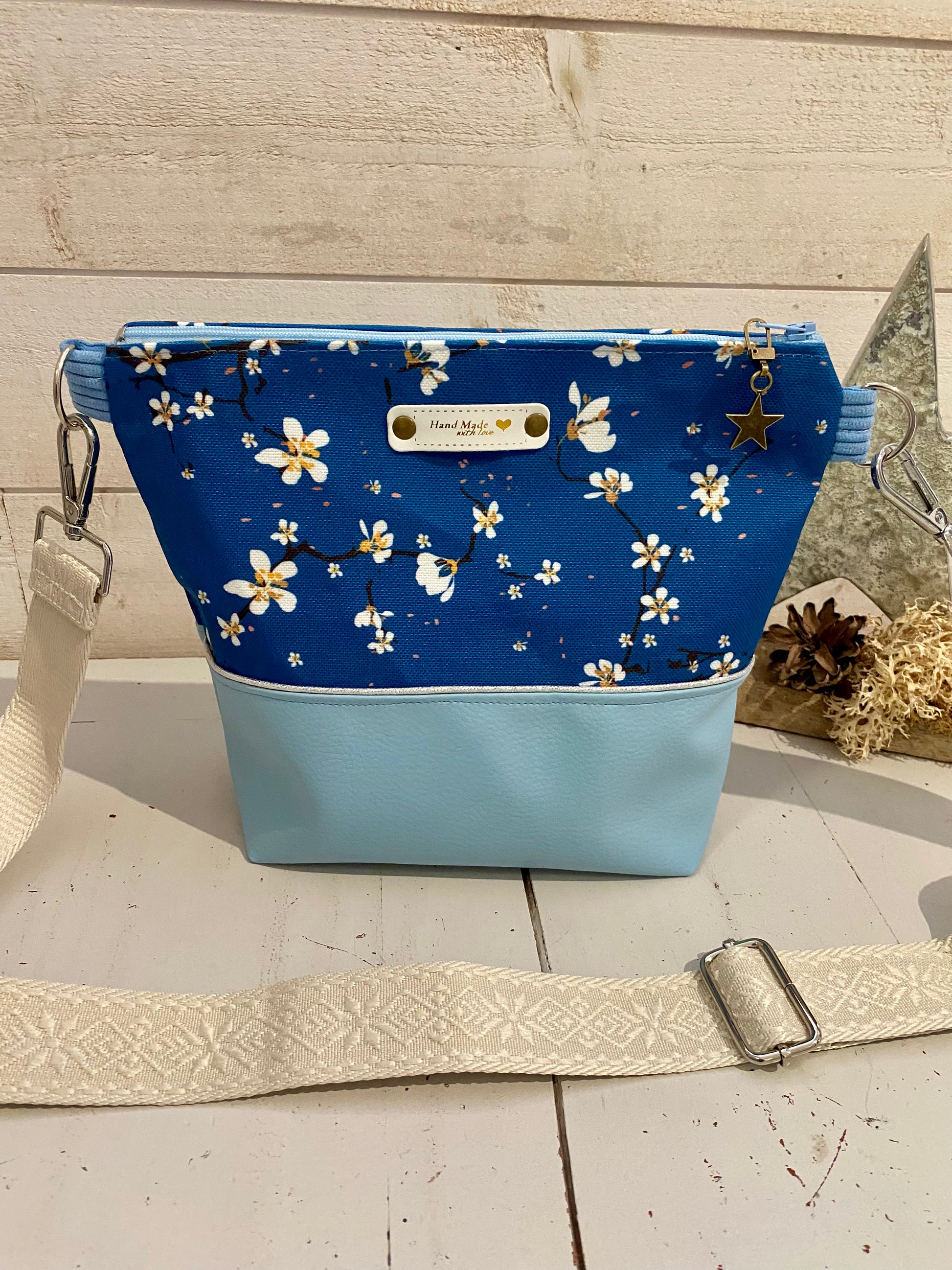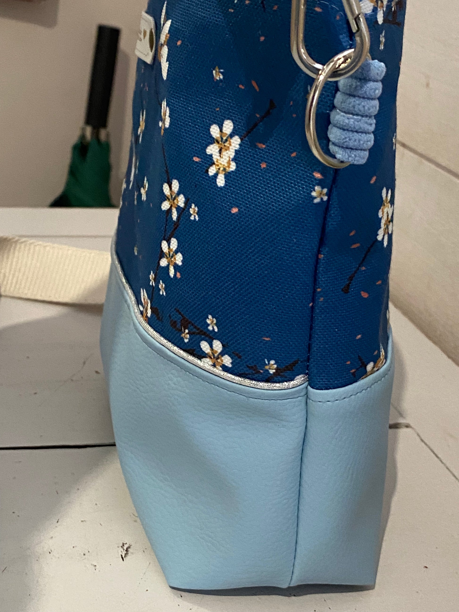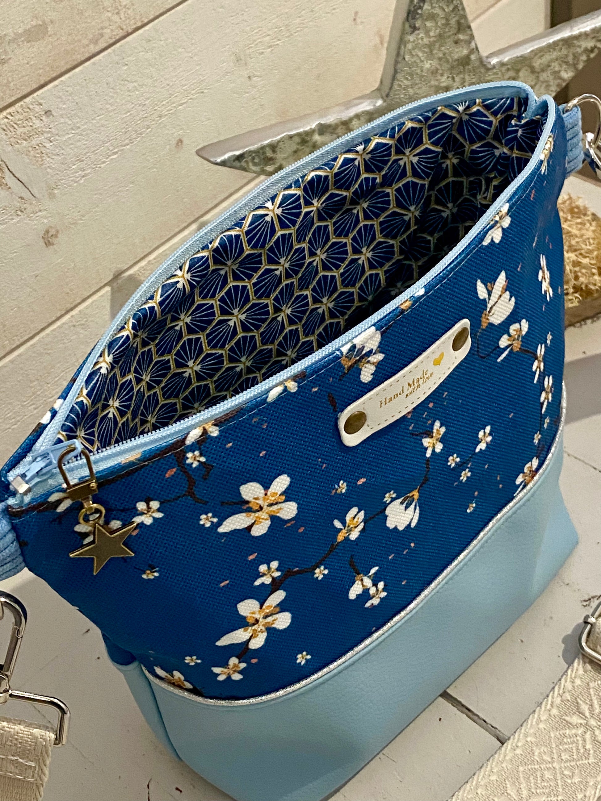 Cette petite beauté est en toile imprimée en France 🇫🇷 sur fond bleu et simili bleu clair pour le bas du sac .