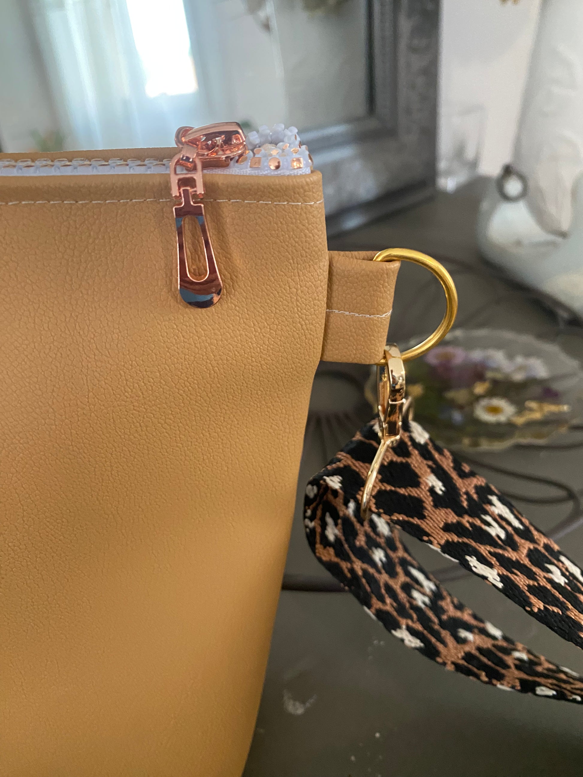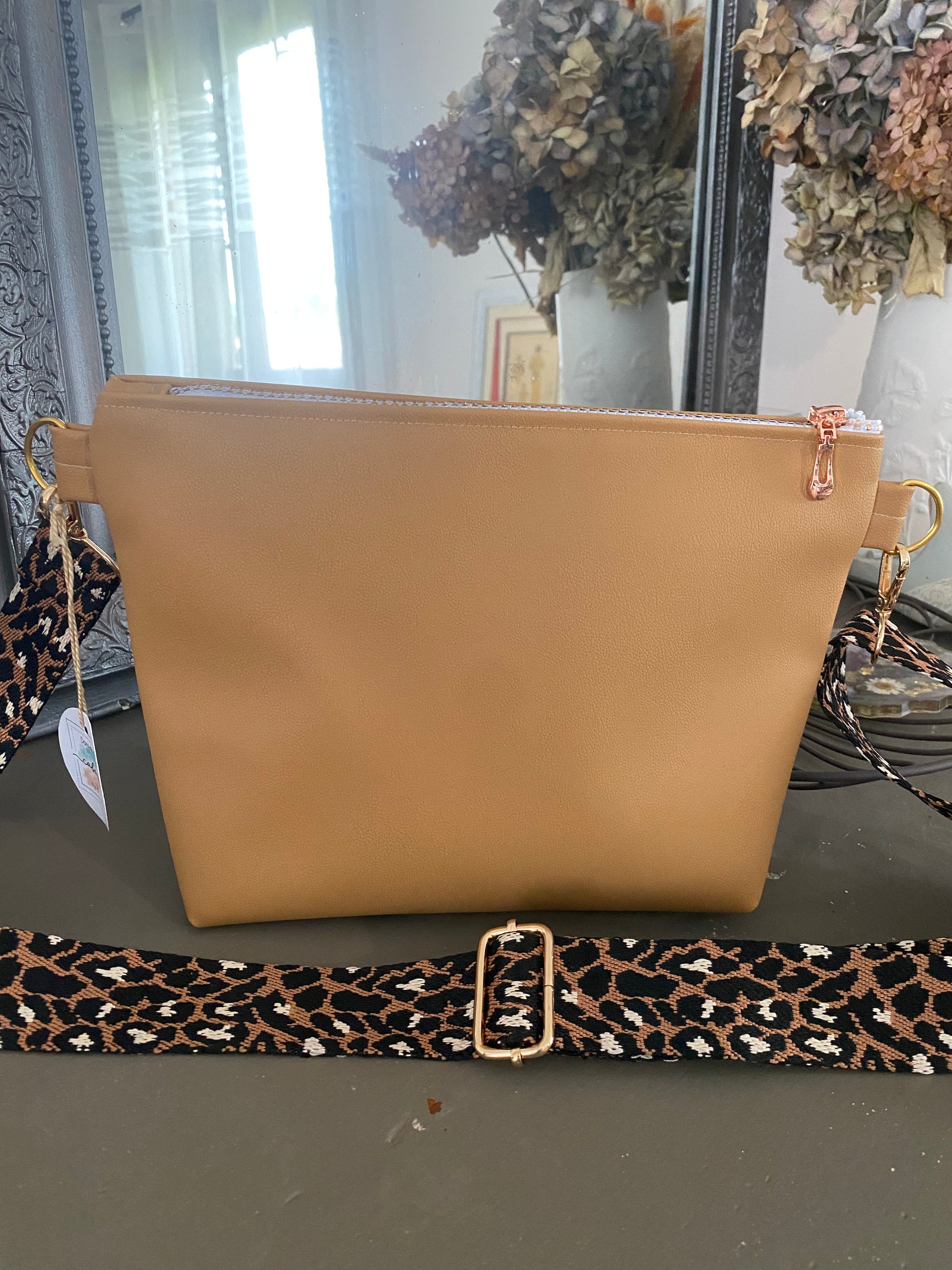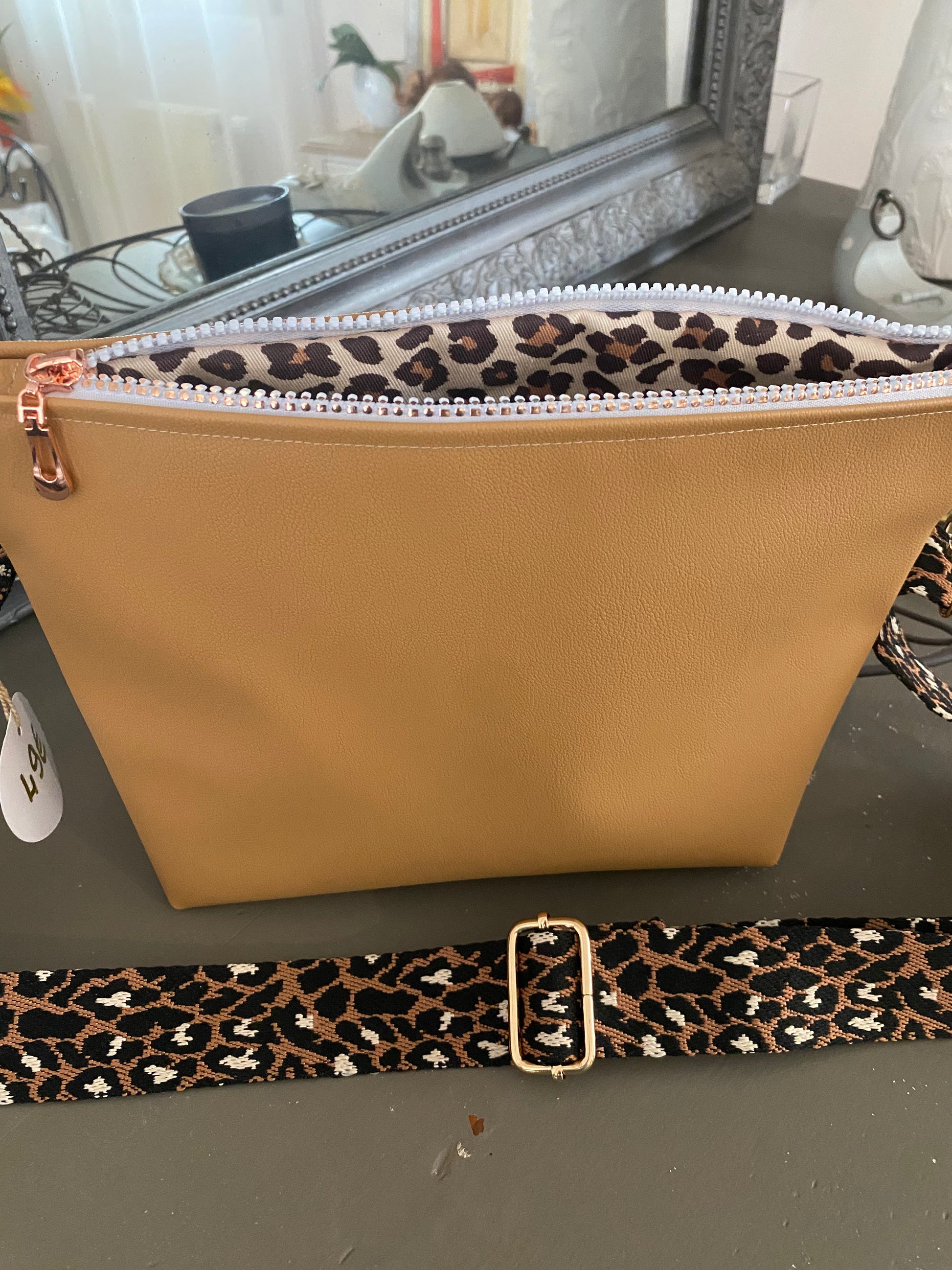 Sac simili couleur havane , sangle textile léopard réglable et amovible.